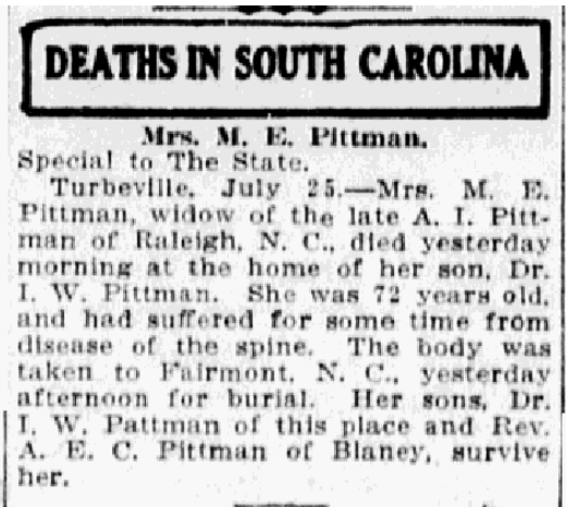 Turberville, July 25. – Mrs. M. E. Pittman, widow of the late A. I. Pittman of Raleigh, N. C., died yesterday morning at the home of her son, Dr. I. W. Pittman. She was 72 years old, and had suffered for some time from disease of the spine. The body was taken to Fairmont, N. C., yesterday afternoon for burial. Her sons, Dr. I. W. Pittman of this place and Rev. A. E. C. Pittman of Blaney, survive her.