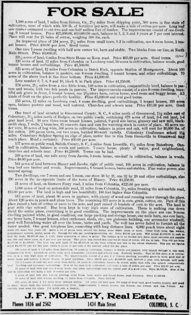 325 acres of land, 12 miles from Columbia in Dutch Fork, opposite Station of Montgomery. About 100 acres in cultivation, balance in pasture, one 8-room dwelling, 3 tenant houses, and other outbuildings. 70 acres of the above tract is fine river bottom. Price $4,500.00