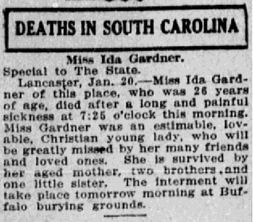 Lancaster, Jan. 20.-Miss Ida Gardner of this place, who was 26 years of age, died after a long and painful sickness at 7:25 o’clock this morning. Miss Gardner was an estimable, lovable, Christian young lady, who will be greatly missed by her many friends and loved ones. She is survived by her aged mother, two brothers, and one little sister. The interment will take place tomorrow morning at Buffalo burying grounds.