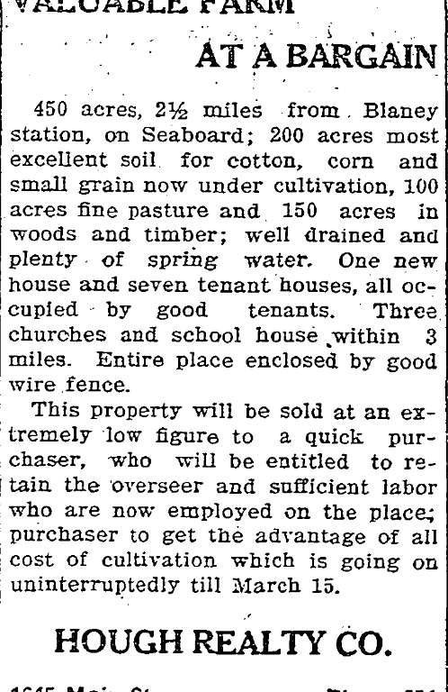 450 Acres, 2 1/2 miles from Blaney station, on Seaboard; 200 acres most excellent soil for cotton, corn and small grain now under cultivation, 100 acres fine pasture and 150 acres in woods and timber; well drained and plenty of spring water. One new house and seven tenant houses, all occupied by good tenants. Three churches and school house within 3 miles. Entire place enclosed by good wire fence.