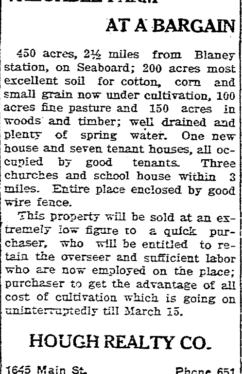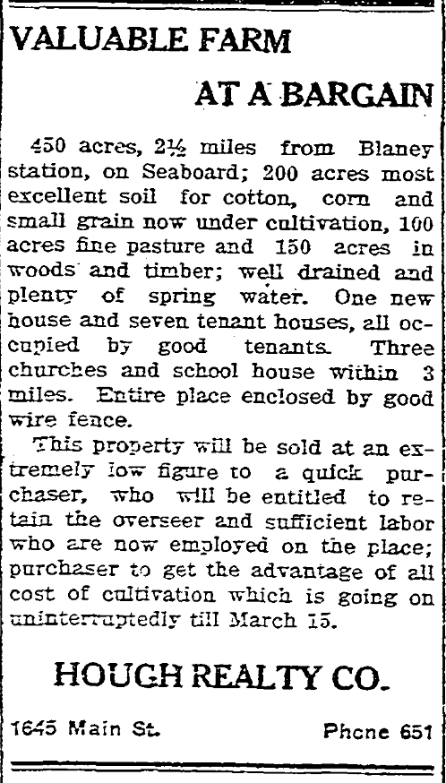 450 Acres, 2 1/2 miles from Blaney station, on Seaboard; 200 acres most excellent soil for cotton, corn and small grain now under cultivation, 100 acres fine pasture and 150 acres in woods and timber; well drained and plenty of spring water. One new house and seven tenant houses, all occupied by good tenants. Three churches and school house within 3 miles. Entire place enclosed by good wire fence.