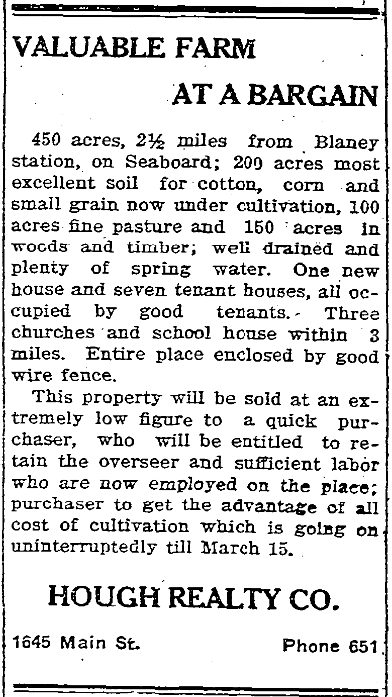 450 Acres, 2 1/2 miles from Blaney station, on Seaboard; 200 acres most excellent soil for cotton, corn and small grain now under cultivation, 100 acres fine pasture and 150 acres in woods and timber; well drained and plenty of spring water. One new house and seven tenant houses, all occupied by good tenants. Three churches and school house within 3 miles. Entire place enclosed by good wire fence.