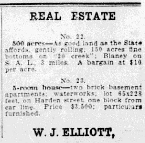 No. 22. 500 acres – As good land as the State affords, gently rolling; 150 acres fine bottoms on “20 Creek”; Blaney on S. A. L. 3 miles. A bargain at $10 per acre. No. 23. 5-room house – two brick basements apartments; waterworks; lot 65×228 feet, on Harden street, one block from car line. Price $3,500; particulars furnished. W. J. Elliott, Continue reading Real Estate