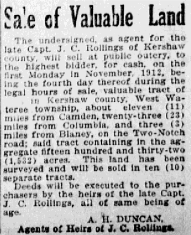 The undersigned, as agent for the late Capt. J. C. Rollings of Kershaw county, will see at public outery, to the highest bidder, for cash, on the first Monday in November, 1912, being the fourth day thereof, during the legal hours of sale, valuable tract of land in Kershaw county, West Wateree Township, about eleven (11) miles from Camden, twenty-three (23) miles from Columbia, and three (3) miles from Blaney, on the Two-Notch road; said tract containing in the aggregate fifteen hundred and thirty-two (1532) acres. This land has been surveyed, and will be sold in ten (10) separate tracts.