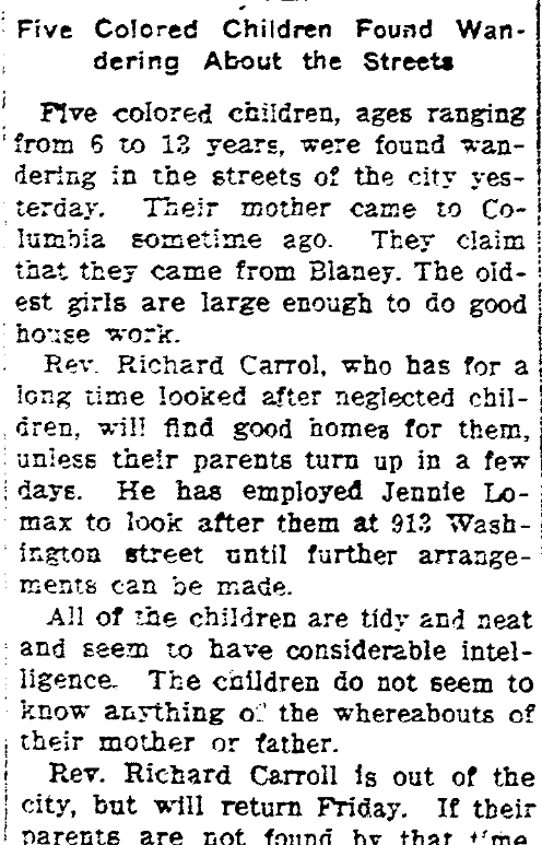 Took Them to Blaney. Colored Woman Cared for Them While Here. The five colored children who were found by a policeman wandering around on Tuesday afternoon were turned over to Jennie Lomax, by the policeman, as she said that she would care for them until their parents could be located. The father of the children came from them on Wednesday about midday and she turned … Continue reading Father Found Children