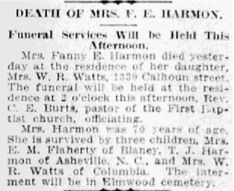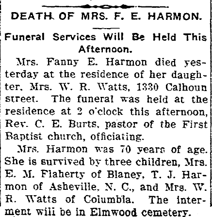 Mrs. Fanny E. Harmon died yesterday, at the residence of her daughter, Ms W. R. Watts, 1330 Calhoun Street. The funeral was held at the residence at 2 o’clock this afternoon, Rev. C. E. Burts, pastor of the First Baptist church, officiating.