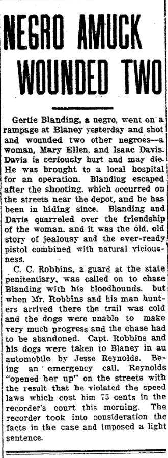 Gertie Blanding, a negro, went on a rampage at Blaney yesterday and shot and wounded two other negroes – a woman, Mary Ellen, and Isaac Davis. Davis is seriously hurt and may die. He was brought to a local hospital for an operation. Blanding escaped after the shooting, which occurred on the streets near the depot, and he has been in hiding since. Blanding and Davis quarreled over the friendship of the woman, and it was old, old story of jealousy and the ever-ready pistol combined with natural viciousness.