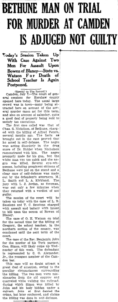 The first case called was that of Chas S. Nicholson, of Bethune, charged with the killing of Alfred Peters, several months ago. The facts as brought out in the case proved that the acted in self-defense. The negro was acting disorderly in the drug store of Dr. Holder when Nicholson remonstrated with him. The negro promptly made for his gun, but the white man was too quick and the negro was killed. Several eyewitnesses, including prominent citizens of Bethune were put on the stand and a clear case of self-defense was made out by the defendant’s attorneys, M. L. Smith and L. A. Kirkland. The jury with L. J. Jordan, as forman, was out only a few minutes when they returned with a verdict of not guilty.