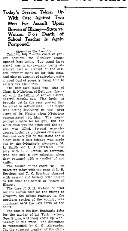 Camden, July 7. – The court of general sessions for Kershaw county opened here today. The usual large crowd was in town – many being attracted her on account of the several murder cases set for this term, and also on account of salesday, quite a good deal of property being sold to satisfy tax executions.