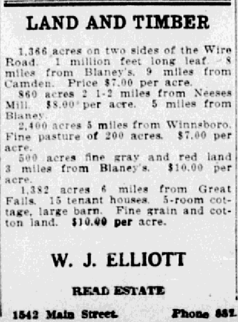 1,366 acres on two sides of the Wire Road. 1 million feet long leaf. 8 miles from Blaney’s, 9 miles from Camden. Priced $7.00 per acre.