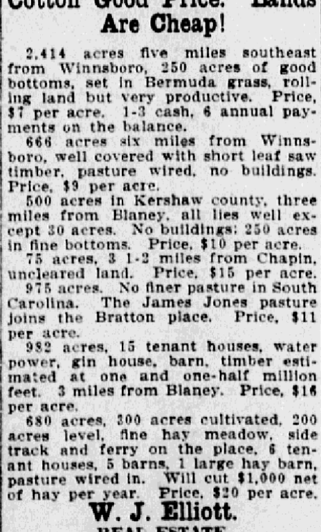 975 acres, No finer pasture in South Carolina. The James Jones pasture joins the Bratton place. Price, $11 per acre.