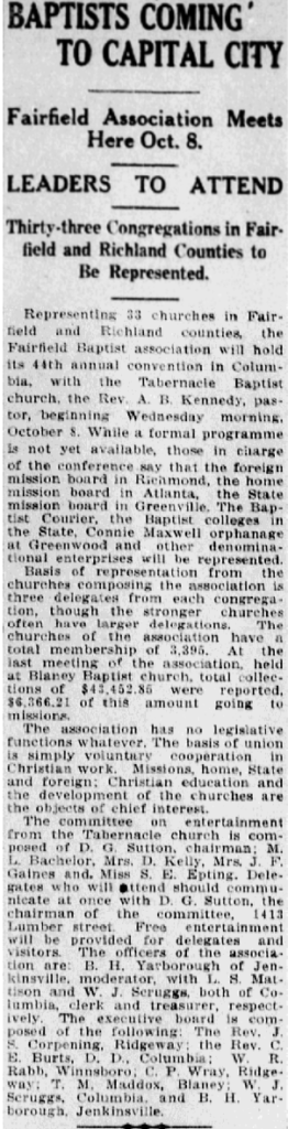 Representing 33 churches in Fairfield and Richland counties, the Fairfield Baptist association will hold its 44th annual convention in Columbia, with the Tabernacle Baptist church, the Rev. A. B. Kennedy, pastor, beginning Wednesday morning, October 8. While a formal programme is not yet available, those in charge of the conference say that the foreign mission board in Richmond, the home mission board in Atlanta, the State mission board in Greenville. The Baptist Courier, the Baptist colleges in the State, Connie Maxwell orphanage at Greenwood and other denominational enterprises will be represented.