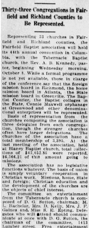 Representing 33 churches in Fairfield and Richland counties, the Fairfield Baptist association will hold its 44th annual convention in Columbia, with the Tabernacle Baptist church, the Rev. A. B. Kennedy, pastor, beginning Wednesday morning, October 8. While a formal programme is not yet available, those in charge of the conference say that the foreign mission board in Richmond, the home mission board in Atlanta, the State mission board in Greenville. The Baptist Courier, the Baptist colleges in the State, Connie Maxwell orphanage at Greenwood and other denominational enterprises will be represented.