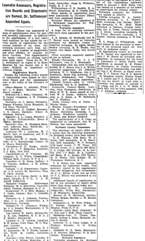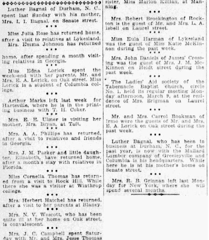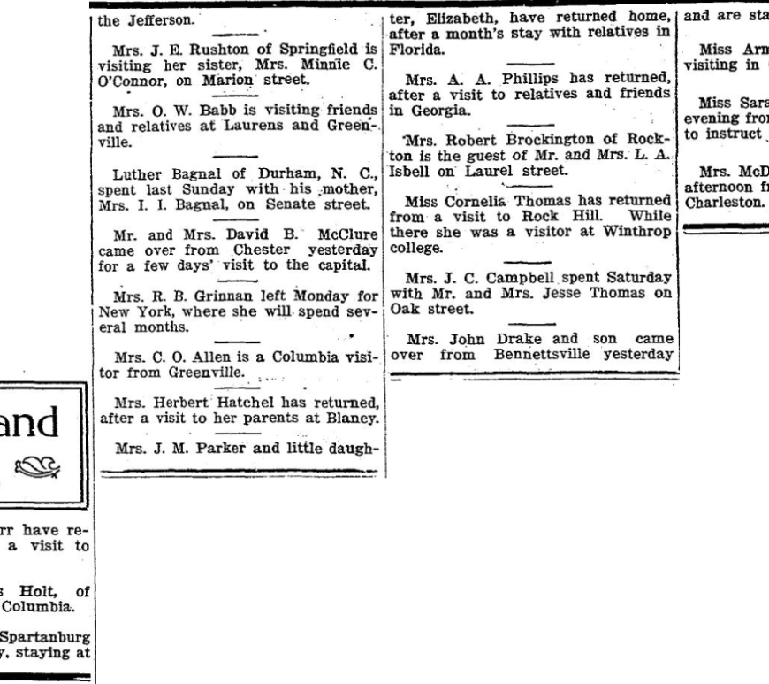 J. T. Butler has returned from a short trip to Blaney. Mrs. Charles Fleming and son, Lorick, are visiting Mrs. Wallace Lorick at Irmo. The Ladies’ Aid society of the Methodist church held its regular meeting WEdnesday afternoon at the residence of Mrs. Bedford Ott in Shandon Annex. After the usual business had been dispensed with the hostess invited the guest into the dining room, … Continue reading Waverly