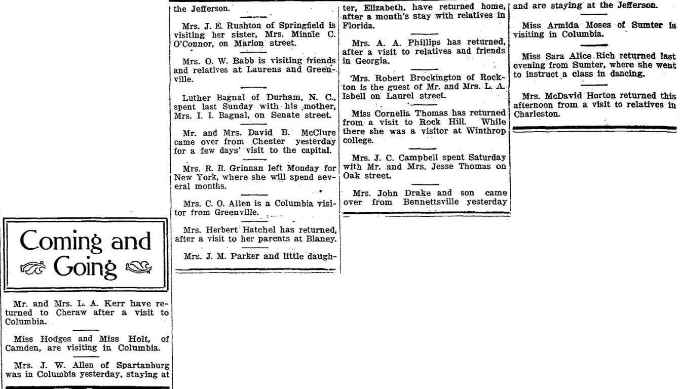 Mrs. John Drake and son came over from Bennettsville yesterday and are staying at the Jefferson.