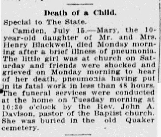 Camden, July 15. – Mary the 10-year-old daughter of Mr. and Mrs. Henry Blackwell, died Monday morning after a brief illness of pneumonia. The little girl was at church on Saturday and friends were shocked and grieved on Monday morning to hear of her death, pneumonia having put in its fatal work in less than 48 hours. The funeral services were conducted at the home on Tuesday morning at 10:30 o’clock by the Rev. John A. Davidson, pastor of the Baptist church. She was buried in the old Quaker cemetery.