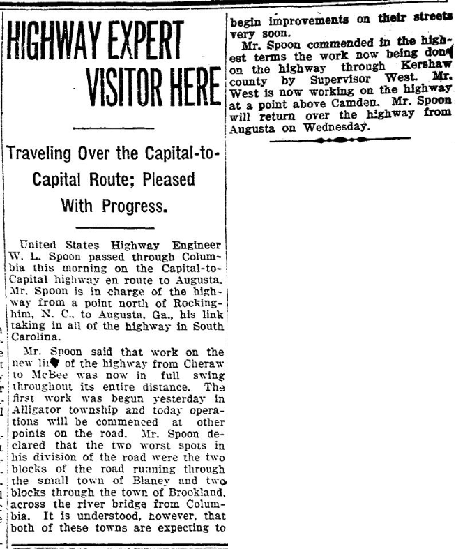 Mr. Spoon commended the highest terms the work now bing done on the highway through Kersahw county by Supervisor West. Mr. West is now working on the highway at a point above Camden. Mr. Spoon will return over the highway from Augusta on Wednesday.