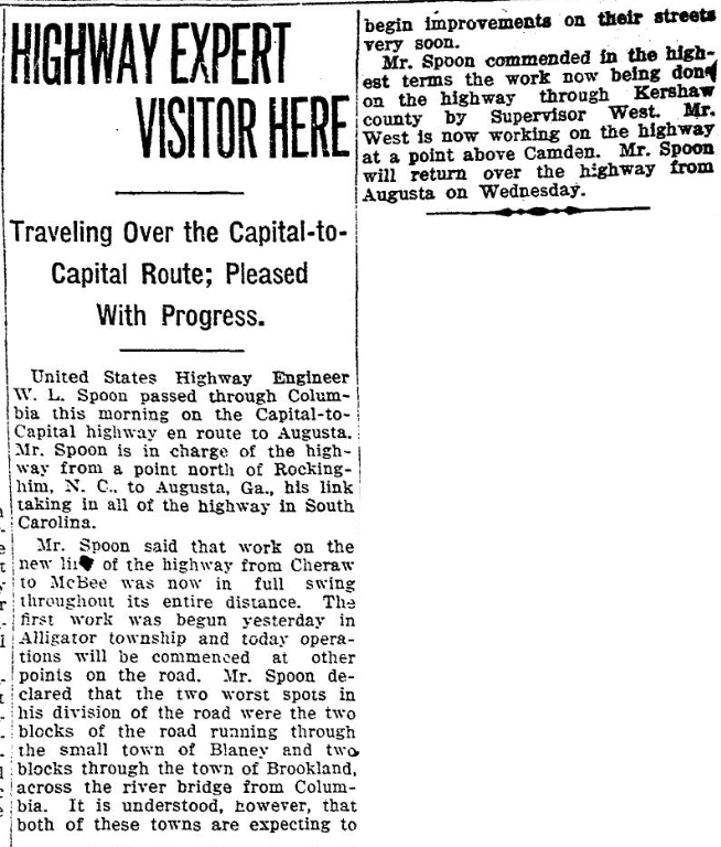 United States Highway Engineer W. L. Spoon passed through Columbia this morning on the Capital-to-Capital Highway en route to Augusta. Mr. Spoon is in charge of the highway from a point north of Rockingham, N. C., to Augusta, Ga., his link taking in all of the highway in South Carolina.