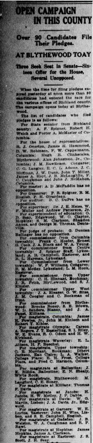 For superintendent of Education – O. D. Seay, Edgewood; W. O. Claytor, Hopkins; S. M. Clarkson, Shandon Annex, and George M. Thomas, Dentsville.