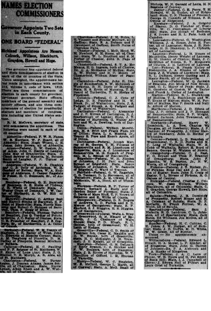 Newberry – Federal, Harry W. Dominick, L. A. Tew, Charles W. Douglas, all of Newberry; State, J. P. Harmon of Prosperity, J. Oliver Havird of Newberry, John G. Helder of Whitmire.
