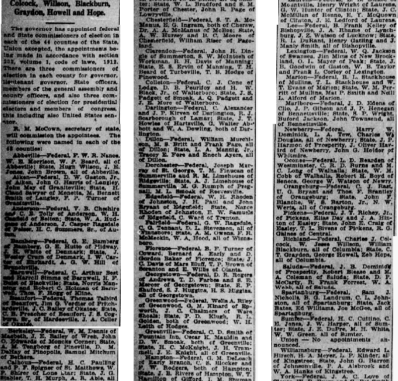 Newberry – Federal, Harry W. Dominick, L. A. Tew, Charles W. Douglas, all of Newberry; State, J. P. Harmon of Prosperity, J. Oliver Havird of Newberry, John G. Helder of Whitmire.