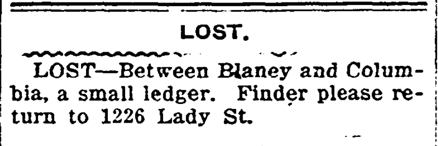 Today in HistoryLost LOST – Between Blaney and Columbia, a small ledger. Finder please return to 1226 Lady St. November 2, 1914 Columbia Record (published as The Columbia Record) Columbia, South CarolinaPage 6