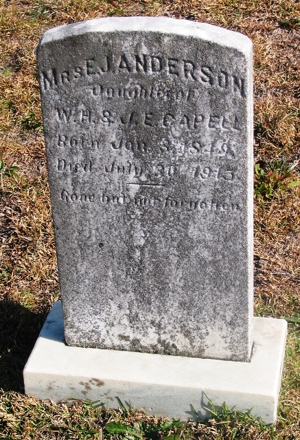 1849 Elizabeth J “Betty” Capell was born on 03 Jan 1849 in Sumter, South Carolina, USA a child of William Henry Capell and Jane Elizabeth Thornly Capell. 1850 Elizth J Caple was counted in the census on 12 Oct 1850 in Sumter, South Carolina, USA, as a 1-year-old, female, white. Also in the home were; William H Caple, Jane E Caple, Charlott A Caple, William … Continue reading Elizabeth J “Betty” Capell Anderson