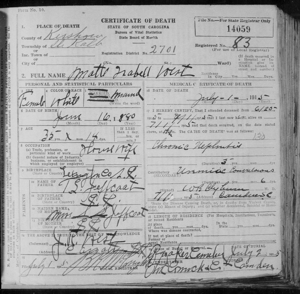 “South Carolina Deaths, 1915-1973”, , FamilySearch (https://www.familysearch.org/ark:/61903/1:1:N9D1-ZQ2 : Mon May 06 18:37:35 UTC 2024), Entry for Matte Isabell West and T.s. Jeffcoat, 1 Jul 1915.