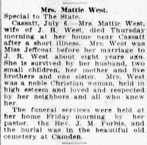 Cassatt, July 6. – Mrs. Mattie West, wife of J. R. West, died Thursday morning at her home near Cassatt after a short illness. Mrs. West was Miss Jeffcoat before her marriage to J. R. West about 8 years ago. She is survived by her husband, two small children, her mother and five brothers and one sister. Mrs. West was a noble Christian woman, held in high esteem and loved and respected by her neighbors and all who knew her.