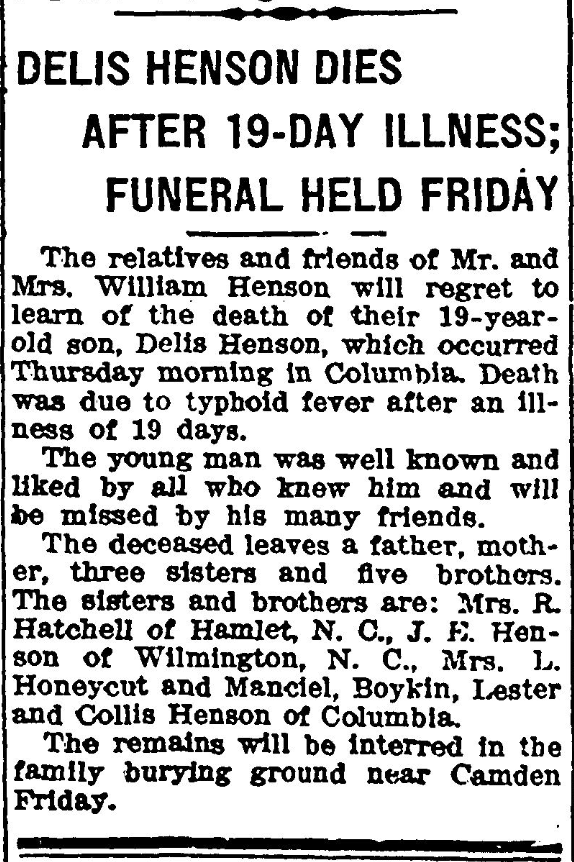 The relatives and friends of Mr. and Mrs. William Henson will regret to lear of the death of their 19-year-old son, Delis Henson, which occurred Thursday morning in Columbia. Death was due to typhoid fever after an illness of 19 days.