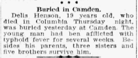 Delis Henson, 19 years old, who died in Columbia Thursday night, was buried yesterday at Camden. The young man had been afflicted with typhoid fever for several weeks. Besides his parents, three sisters and five brothers survive him.