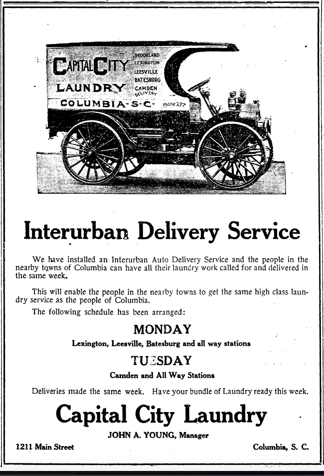 The laundry wagon, motor-driven, is in charge of Charles Dunlap. The first trip of the week, on Mondays, is to Brookland, Lexington, Leesville, Batesburg, and deliveries will be made at these and intermediate points on Thursday.