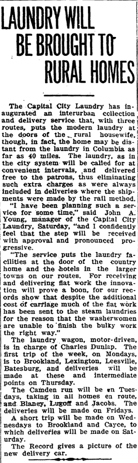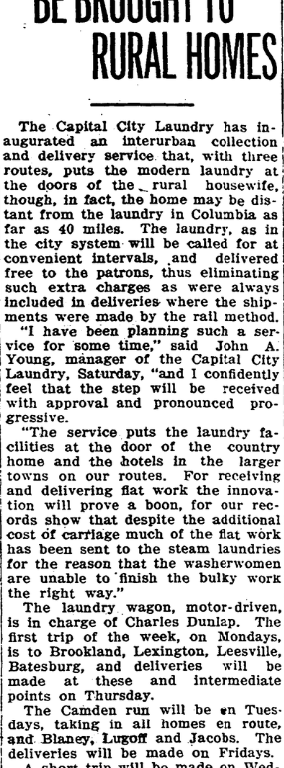 The Capital City Laundry has inaugurated an interurban, collection and delivery service that, with three routes, puts the modern laundry at the doors of the rural housewife, though, in fact, the home may be distant from the laundry in Columbia as far as 40 miles. The laundry, as the city system will be called for at convenient intervals, and delivered free to patrons, thus eliminating such extra charges as were always included in deliveries where the shipments were made by the rail method.