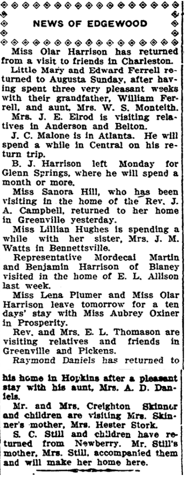 Miss Olar Harrison has returned from a visit to friends in Charleston.