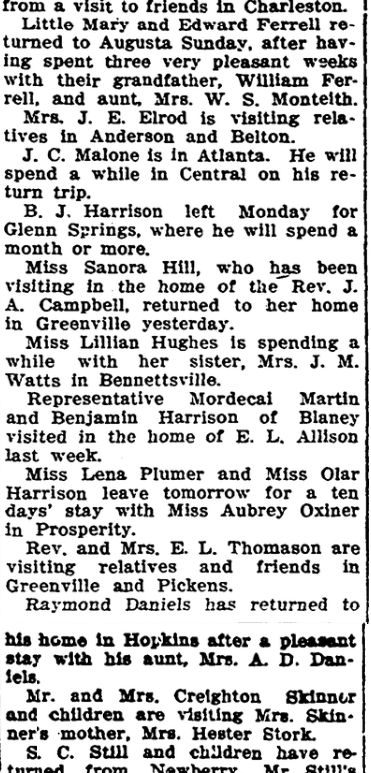 Miss Olar Harrison has returned from a visit to friends in Charleston. Little Mary Ferrell and Edward Ferrell returned to Augusta Sunday, after having spent three very pleasant weeks with their grandfather, William Ferrell, and aunt, Mrs. W. S. Monteith. Mrs. J. E. Elrod is visiting relatives in Anderson and Belton. J. C. Malone is in Atlanta. He will spend a while in Central on … Continue reading News of Edgewood
