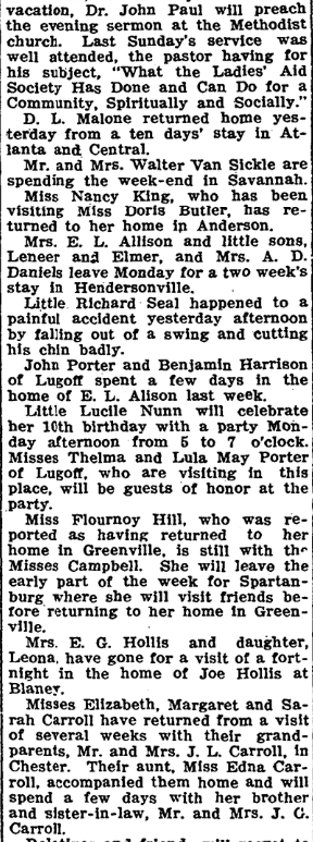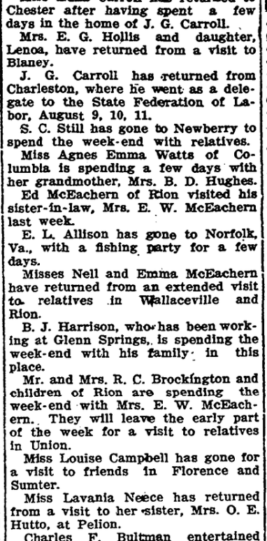 Miss Edna Carroll has returned to Chester after having spent a few days in the home of J. G. Carroll. Mrs. E. G. Hollis and daughter, Leona have returned from a visit to Blaney. J. G. Carroll has returned from Charleston, where he went as delegate to the State Federation of Labor, August 9, 10, 11. S. C. Still had gone to Newberry to spend … Continue reading News of Edgewood