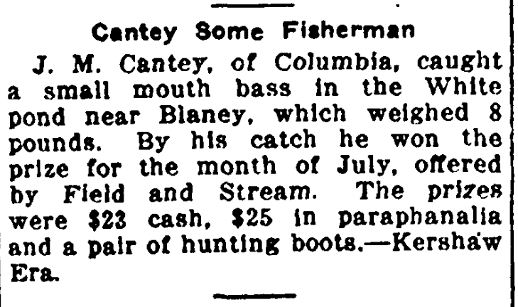 J. M. Cantey, of Columbia, caught a smallmouth bass in the White pond near Blaney, which weighed 8 pounds. By his catch he won the prize for the month of July, offered by Field and Stream. The prizes were $23 cash, $25 in Paraphernalia and a pair of hunting boots. – Kershaw Era. Continue reading Cantey Some Fisherman