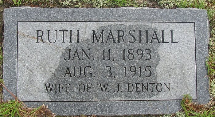 Ruth Marshall was born on 11 Jan 1893. Ruth Marshall married W J Denton. She died on 03 Aug 1915 and was buried in Camden, Kershaw, South Carolina, USA at Mount Zion Baptist Church Cemetery. Tombstone Information: Continue reading Ruth Marshall Denton