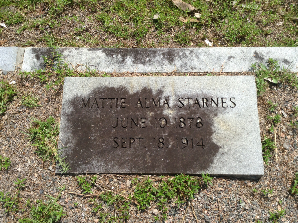 Mattie Alma Starnes was born on 16 Jun 1878 in Fairfield, South Carolina, USA a child of Joseph Wesley Starnes and Mattie E Starnes. She had three siblings, namely: Kate Camilia Starnes, Thomas Woodward Starnes, and Joseph Wesley Starnes Jr.