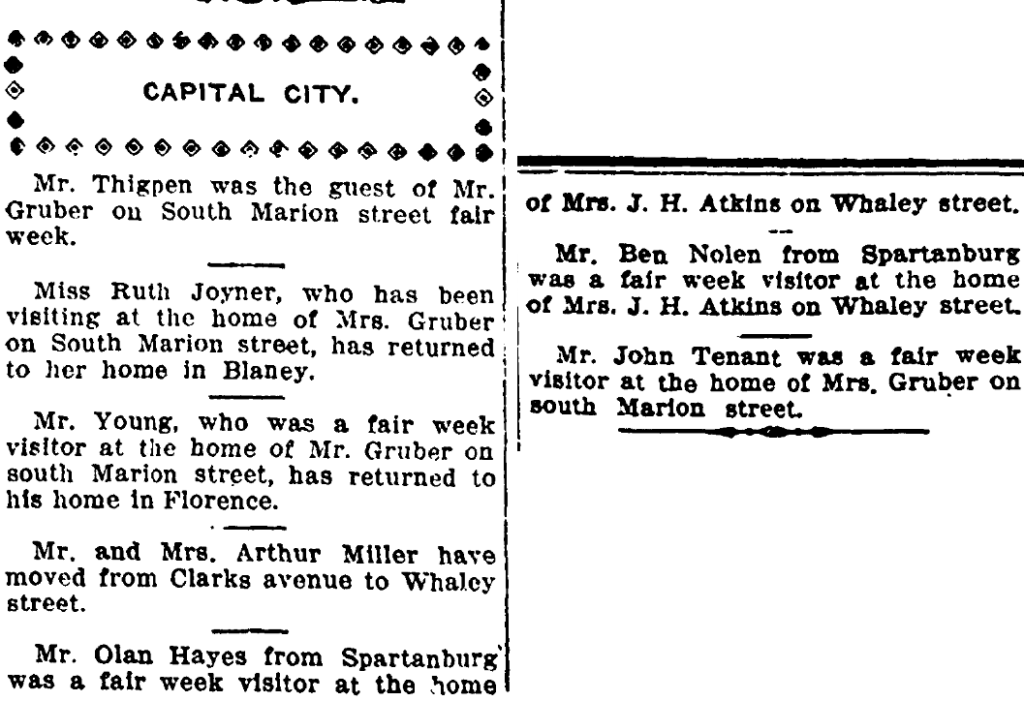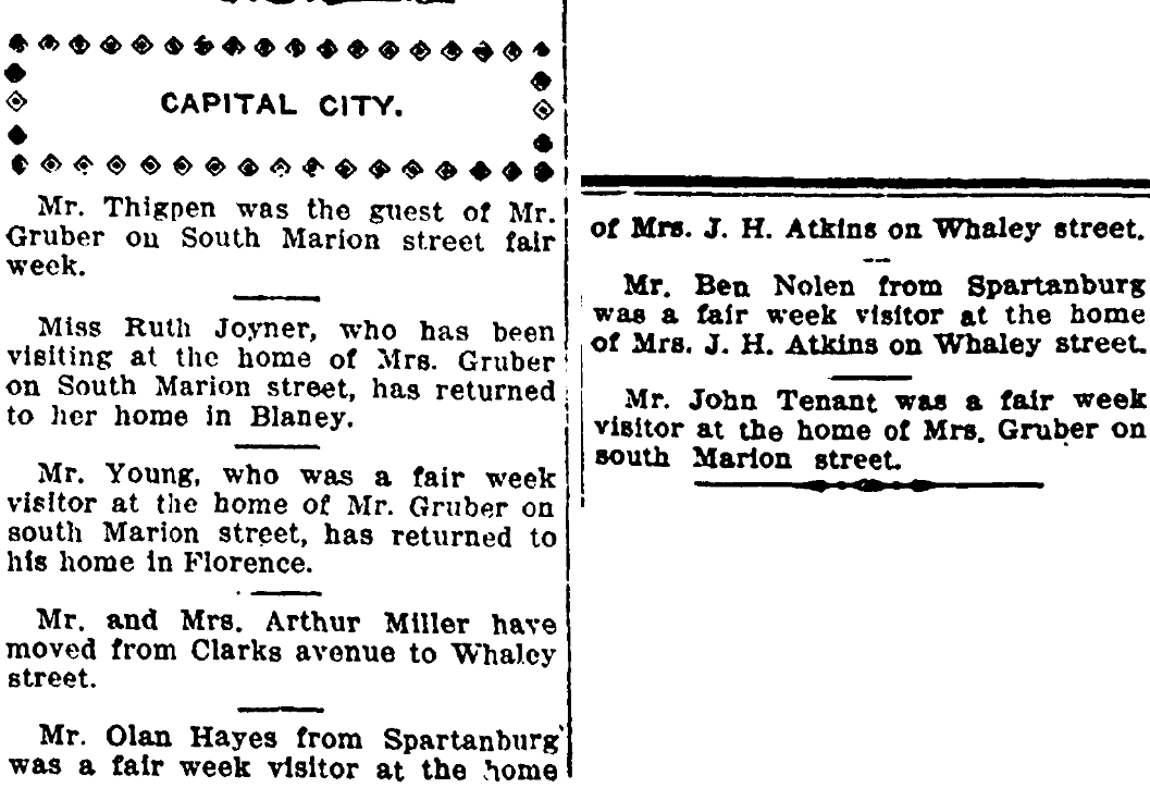 Mr. Ben Nolen from Spartanburg was a fair week visitor at the home of Mrs. J. H. Atkins on Whaley Street.