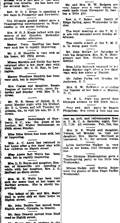 Mrs. W. M. Thomas and children spent Sunday with her sister, Mrs. H. R. Davis, on Taylor street. Miss Ader Thomas was the guest of Miss Lillian Gardner Monday night. Mr. Duke Aughtry got his hand bruised with a belt and it has been diving him trouble. He has been out for several days. Rev. M. O. J. Kreps is spending a few days in … Continue reading Olympia