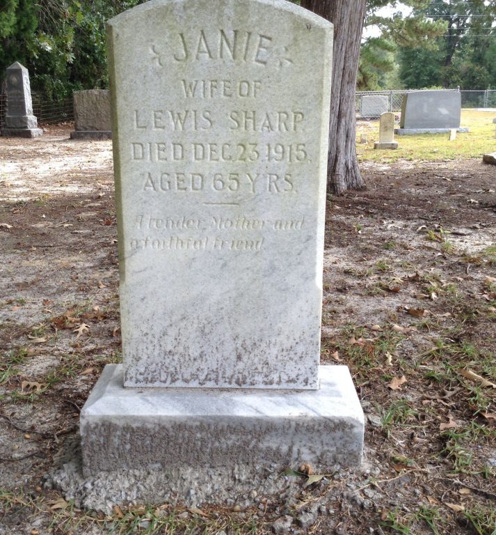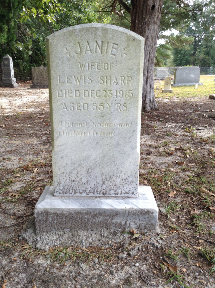 Jane M Sharp was counted on the census on 15 Apr 1910 in Wateree, Kershaw, South Carolina, USA, as a 61-year-old, female, married, white, wife. Also in the home was her husband, Lewis Sharp; and Martha Wilson who was Jane’s aunt.