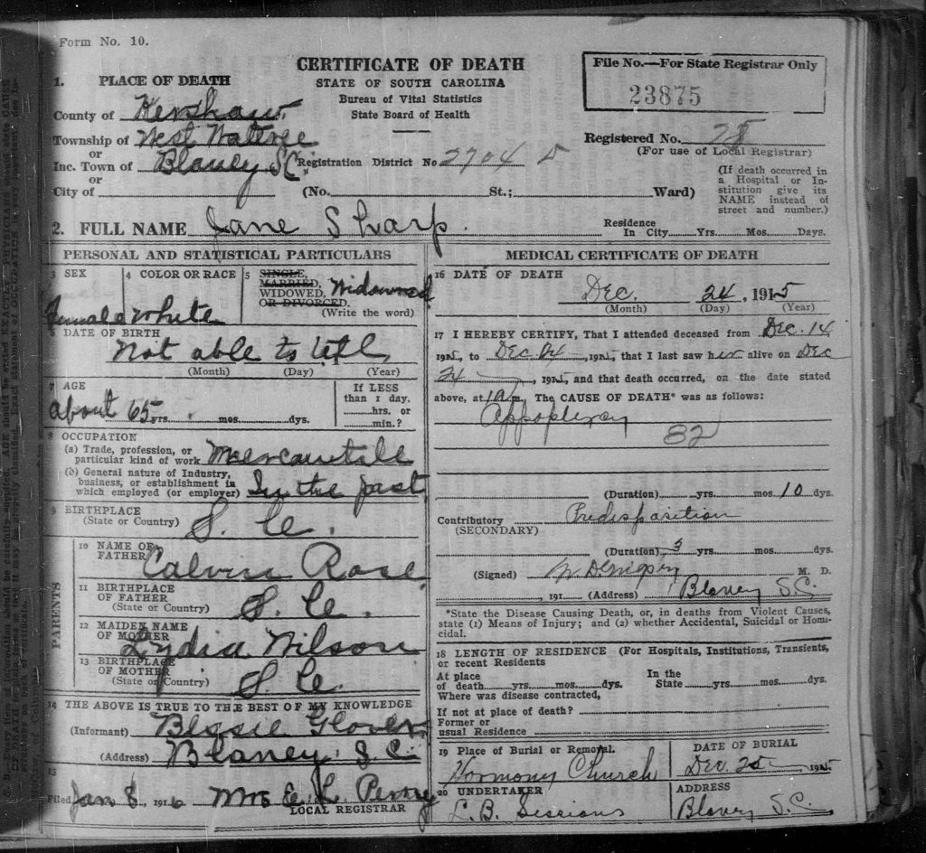 Jane Mourning “Janie” Rose Sharp died on 24 Dec 1915 in Elgin, Kershaw, South Carolina, USA. She was buried on 25 Dec 1915 in Elgin, Kershaw, South Carolina, USA at Harmony Baptist Church Cemetery. Her cause of death was Apoplexy.