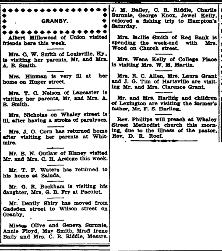Mr. G. R. Beckham is visiting his daughter, Mrs. G. B. Fry at Pacolet.