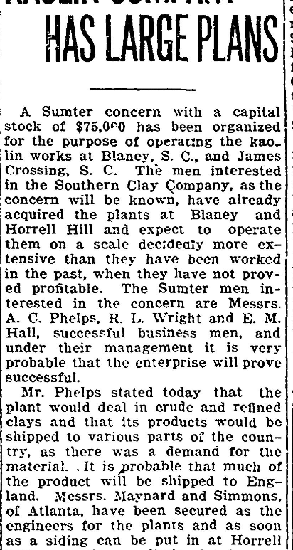 A Sumter concern with a capital stock of $75,000 has been organized for the purpose of operating the kaolin works at Blaney, S. C., and James Crossing, S. C. The men interested in the Southern Clay Company, as the concern will be known, have already acquired the plants at Blaney at Horrell Hill and expect to operate them on a scale decidedly more extensive than … Continue reading KAOLIN COMPANY HAS LARGE PLANS