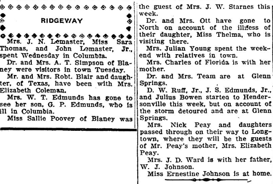 D. W. Ruff, Jr., J. S. Edmunds, Jr., and Julius Bowen started to Hendersonville this week, but on account of the storm detoured and are at Glenn Springs.