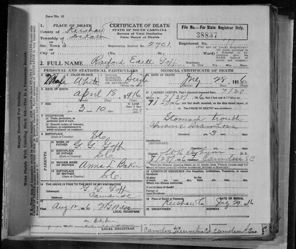 He died on 28 Jul 1916 in De Kalb, Kershaw, South Carolina, USA. Raiford Edell Goff was buried on 29 Jul 1931 in Camden, Kershaw, South Carolina, USA at Antioch Baptist Church Cemetery. His cause of death was stomach trouble chronic diarrhea.