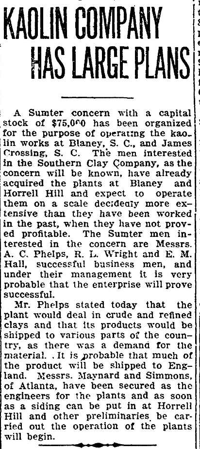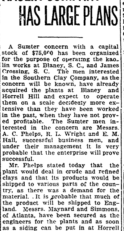 A Sumter concern with a capital stock of $75,000 has been organized for the purpose of operating the kaolin works at Blaney, S. C., and James Crossing, S. C. The men interested in the Southern Clay Company, as the concern will be known, have already acquired the plants at Blaney at Horrell Hill and expect to operate them on a scale decidedly more extensive than they have been worked in the past, when they have no proved profitable. The Sumter men interested in the concern are Messrs. A. C. Phelps, R. L. Wright, and E. M. Hall, successful business men, and under their management it is very probable that the enterprise will prove successful.