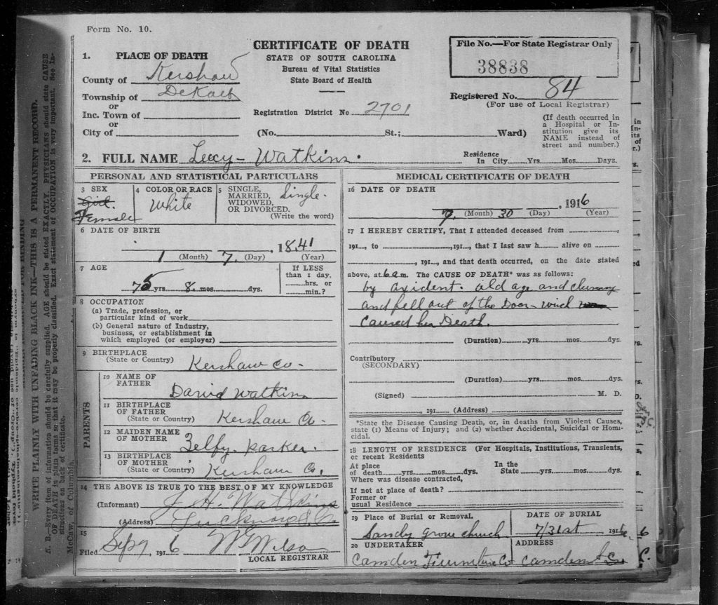 She died on 30 Jul 1916 in De Kalb, Kershaw, South Carolina, USA. She was buried on 31 Jul 1916 in Bethune, Kershaw, South Carolina, USA at Sandy Grove United Methodist Church Cemetery. Her cause of death was by accident, old age and clumsy and fell out of the door which caused her death.