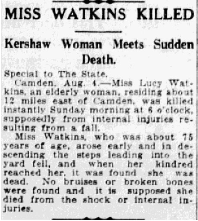Camden, Aug. 4. – Miss Lucy Watkins, an elderly woman, residing about 12 miles east of Camden, was killed instantly Sunday morning at 6 o’clock, supposedly from internal injuries resulting from a fall.